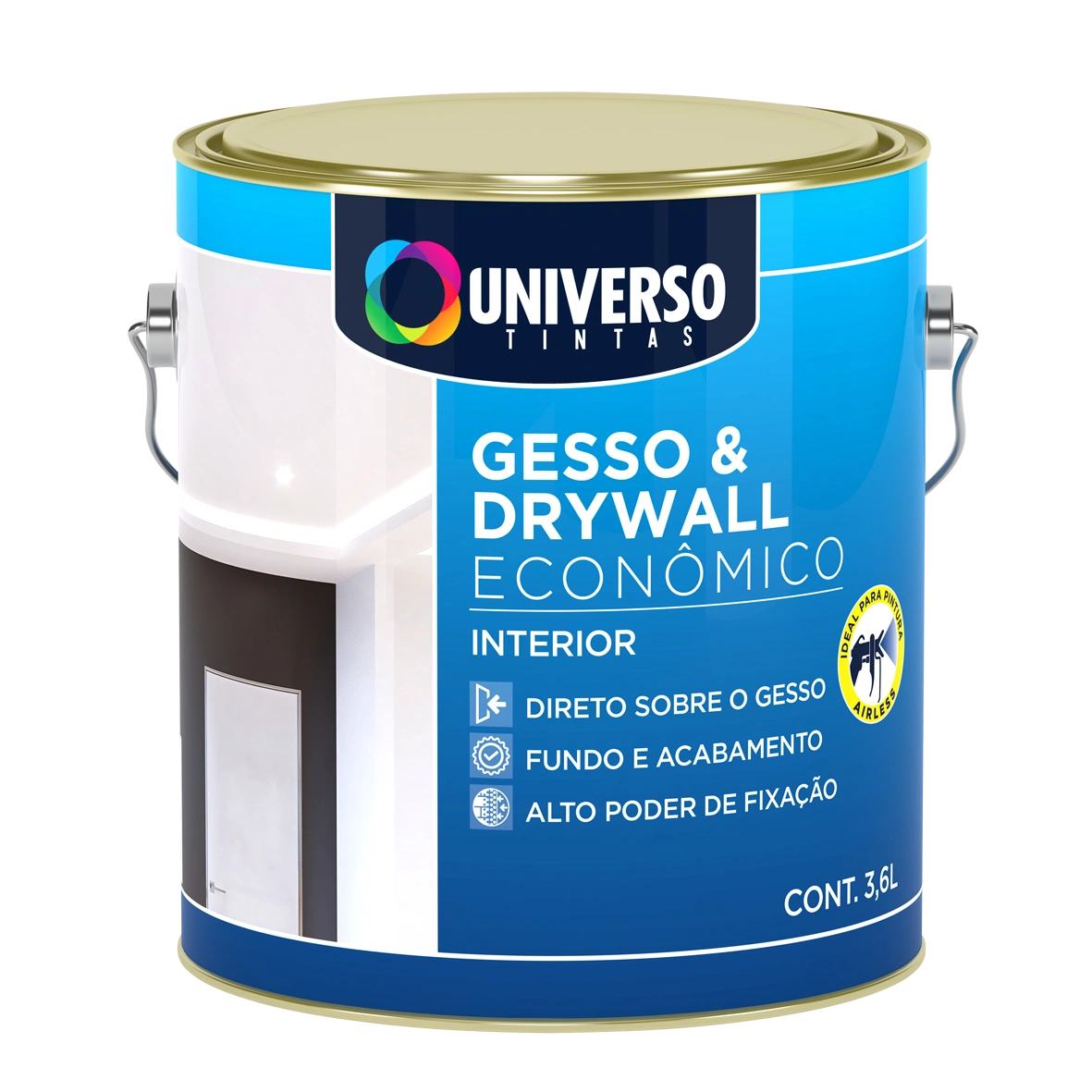 Universo Gesso & Drywall é uma tinta fosca, desenvolvida para aplicação direta sobre superfícies de gesso. Possui ótima cobertura, baixo odor e rápida secagem. Indicado como fundo e acabamento para pintura interna sobre os mais variados tipos de gesso, drywall, sancas e placas de gesso.